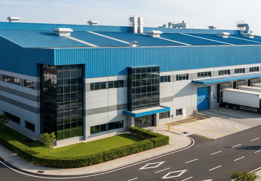 - Trong các công trình công nghiệp: Đây là lĩnh vực ứng dụng phổ biến nhất. Sản phẩm được sử dụng để lợp mái và làm vách cho các nhà máy, nhà xưởng, nhà kho, kho lạnh, và các khu chế xuất. Khả năng chống cháy hiệu quả giúp bảo vệ các dây chuyền sản xuất, máy móc, và hàng hóa giá trị cao, đồng thời đảm bảo an toàn cho hàng trăm, hàng nghìn công nhân đang làm việc.
