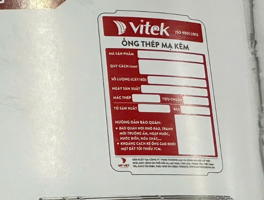 Nội dung trên tem nhãn của bó ống thép mạ kẽm Vitek