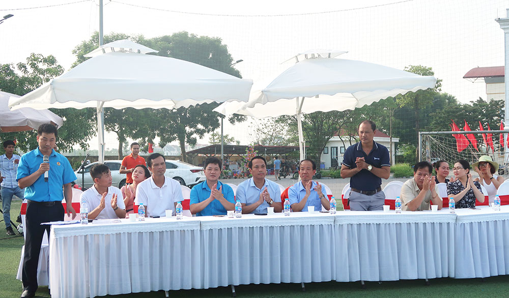Đại diện Công đoàn lao động huyện Văn Lâm tặng hoa cho 2 đội bóng