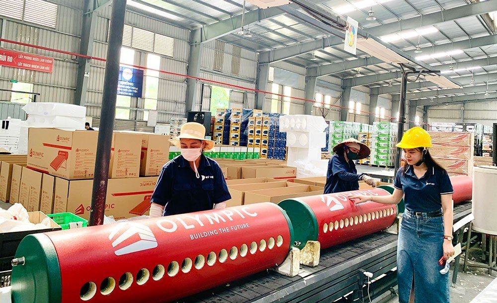 Ông Đào Đình Duy – Phó Giám đốc Nhà máy cũng giới thiệu về các dây chuyền sản xuất ra các sản phẩm bình nước nóng, máy năng lượng mặt trời thương hiệu Olympic.
