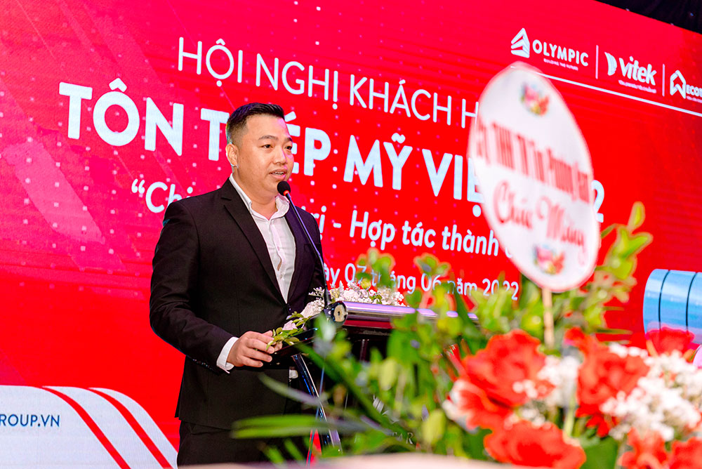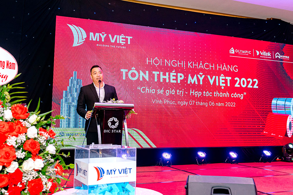 Cũng tại hội nghị, Ông Trần Văn Kiên – GĐ kinh doanh ngành tôn thép cũng chia sẻ những thông tin về công ty Mỹ Việt về dây chuyền sản xuất, sản phẩm, các chương trình công tác xã hội, các giải thưởng Mỹ Việt đạt được và những định hướng phát triển trong thời gian tới với các chương trình ưu đãi thúc đẩy bán hàng trong thời gian tới.